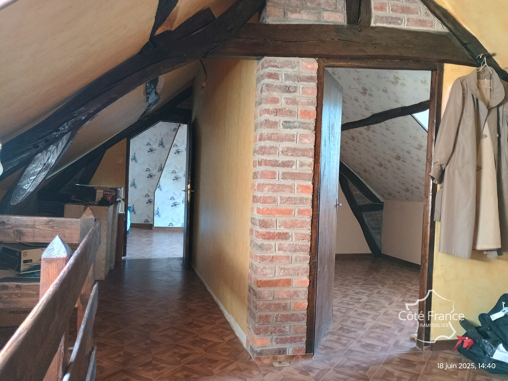 A l'étage, une pièce palière d'environ 13 m² donne accès à 2 chambres mansardées avec le charme des poutres apparentes.