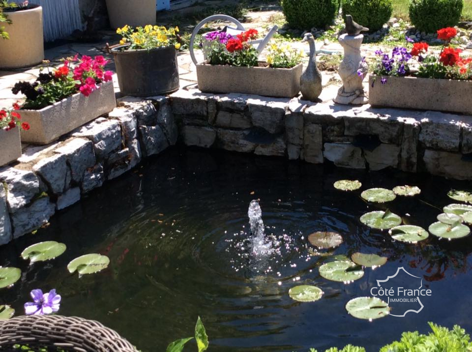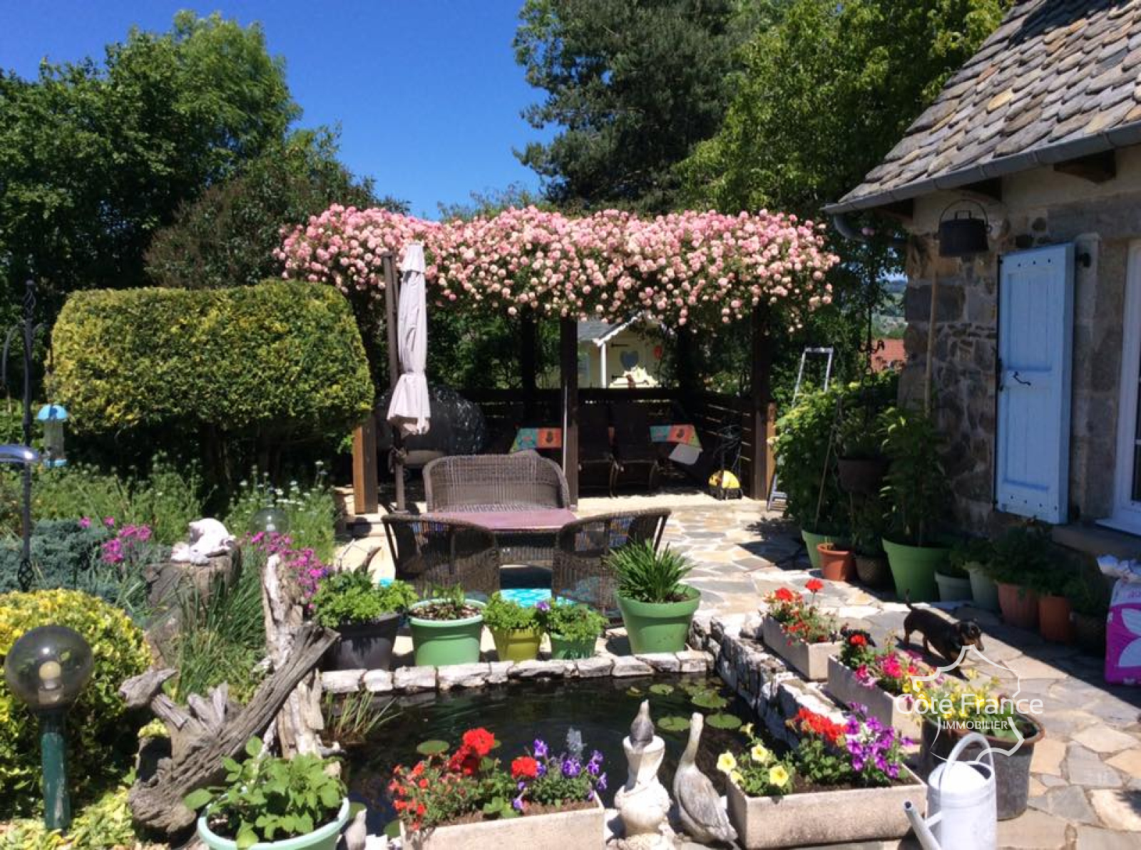 Le jardin de 4 455 m2 entoure la maison et les gites. Il y a plusieurs terrasses, à l'ombre comme au soleil, pour profiter d'un délicieux apéritif en début de soirée, par exemple. Le jardin est rempli de fleurs, de roses anciennes et de plantes rares. Il y a trois étangs dans le jardin qui ajoutent encore plus de charme. Tout est en parfait état, rien n'a besoin d'être fait.