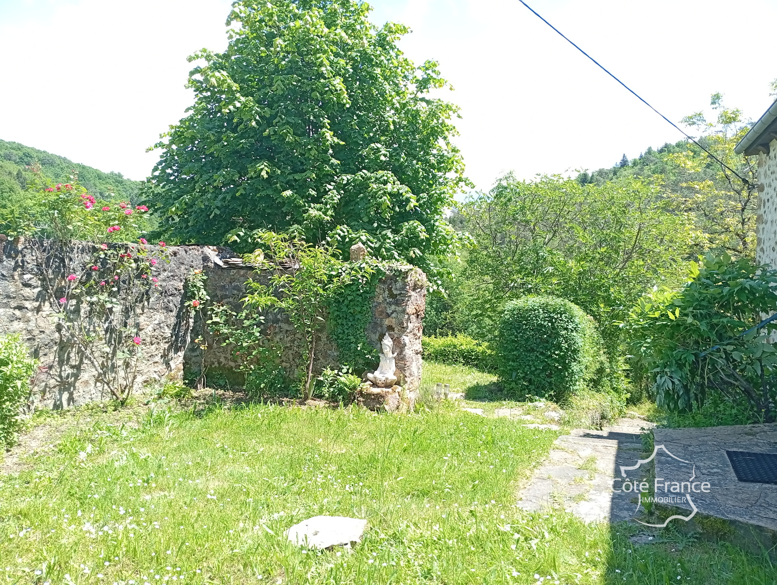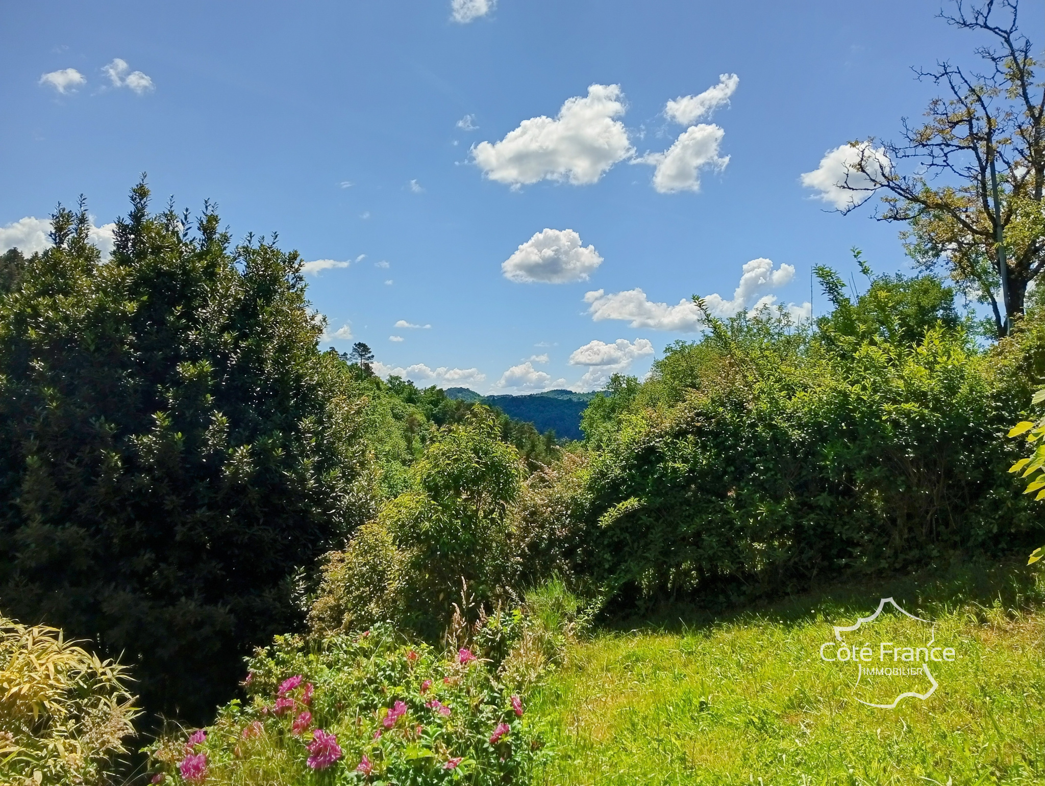 Terrain en pente de 4000 m², dont la moitié en bois, avec de nombreuses terrasses.
