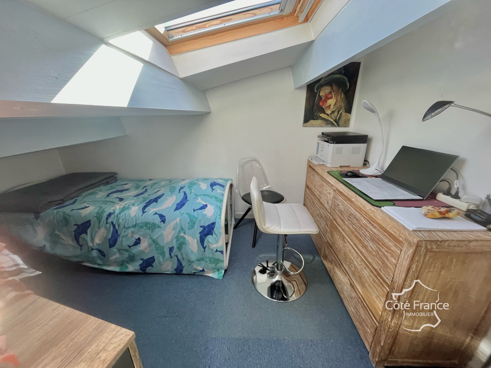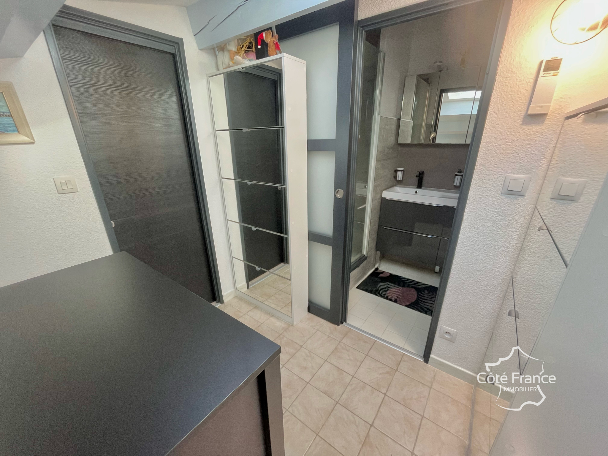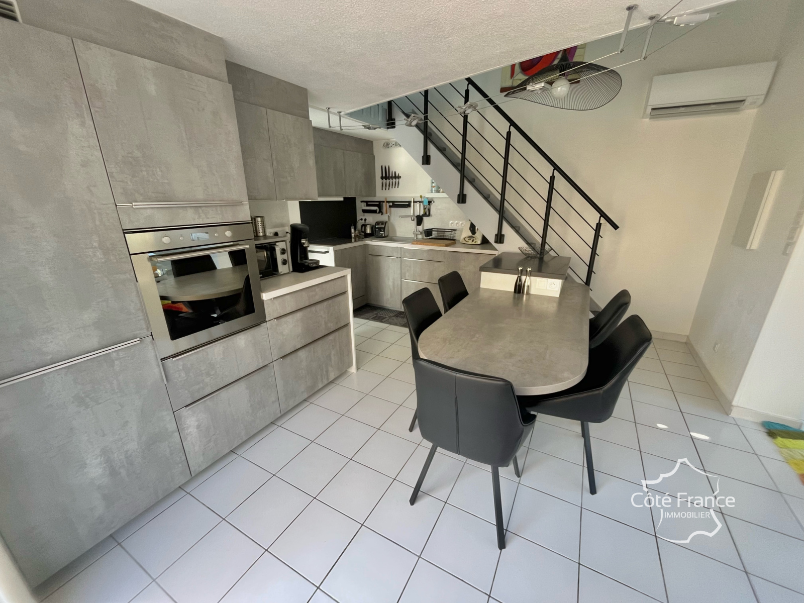 Un intérieur confortable et contemporain: Dès l’entrée, on découvre une superbe cuisine ouverte Mobalpa, aux finitions soignées, avec électroménager entièrement encastré (lave-vaisselle, four, machine à laver…). L’espace salon s’intègre harmonieusement à la pièce de vie, créant une atmosphère conviviale et moderne. Au rez-de-chaussée : – une chambre avec rangements intégrés, – une salle d’eau rénovée, – un WC séparé. À l’étage : – un palier lumineux, aménagé en coin nuit supplémentaire et espace bureau, avec rangements et deux Velux, – une seconde chambre avec placards intégrés, – une deuxième salle d’eau entièrement rénovée.