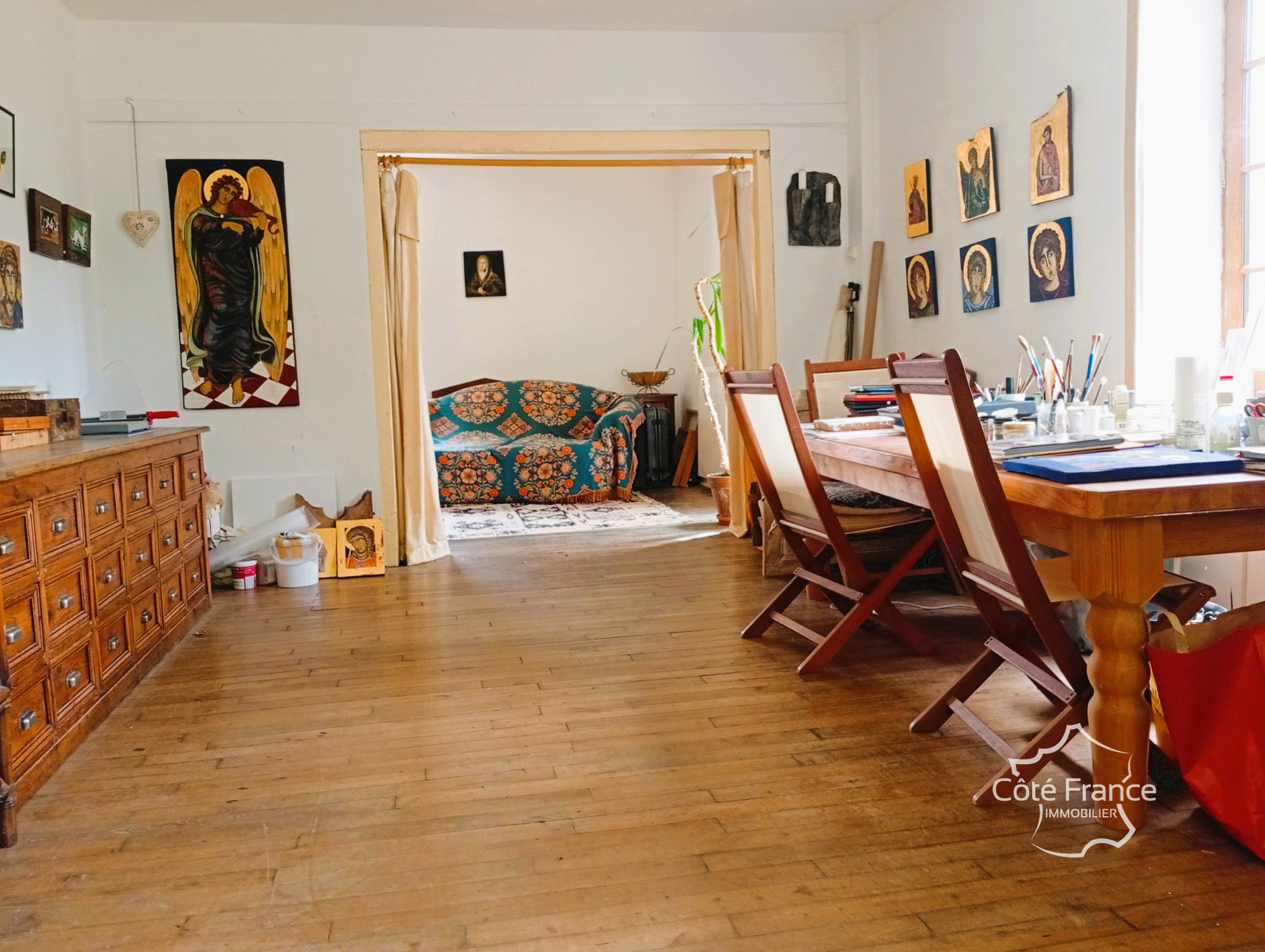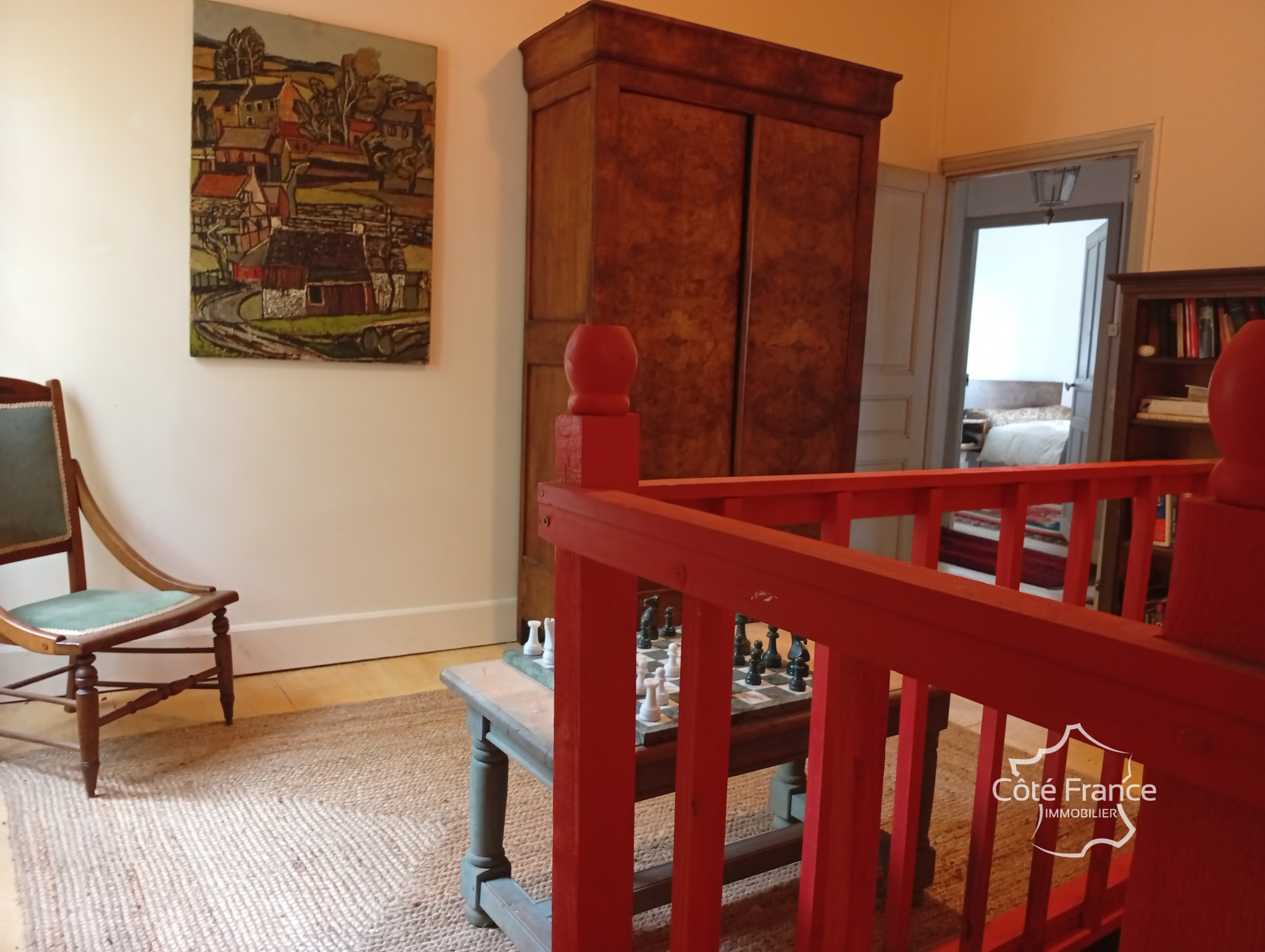 Aile gauche : 3 chambres, WC et salle de bains avec baignoire indépendante Aile droite : Grande pièce en L (env. 50 m²) avec cheminée Godin et accès à un balcon avec escalier en pierre menant au jardin – actuellement utilisée comme atelier/studio mais idéale en appartement d’amis