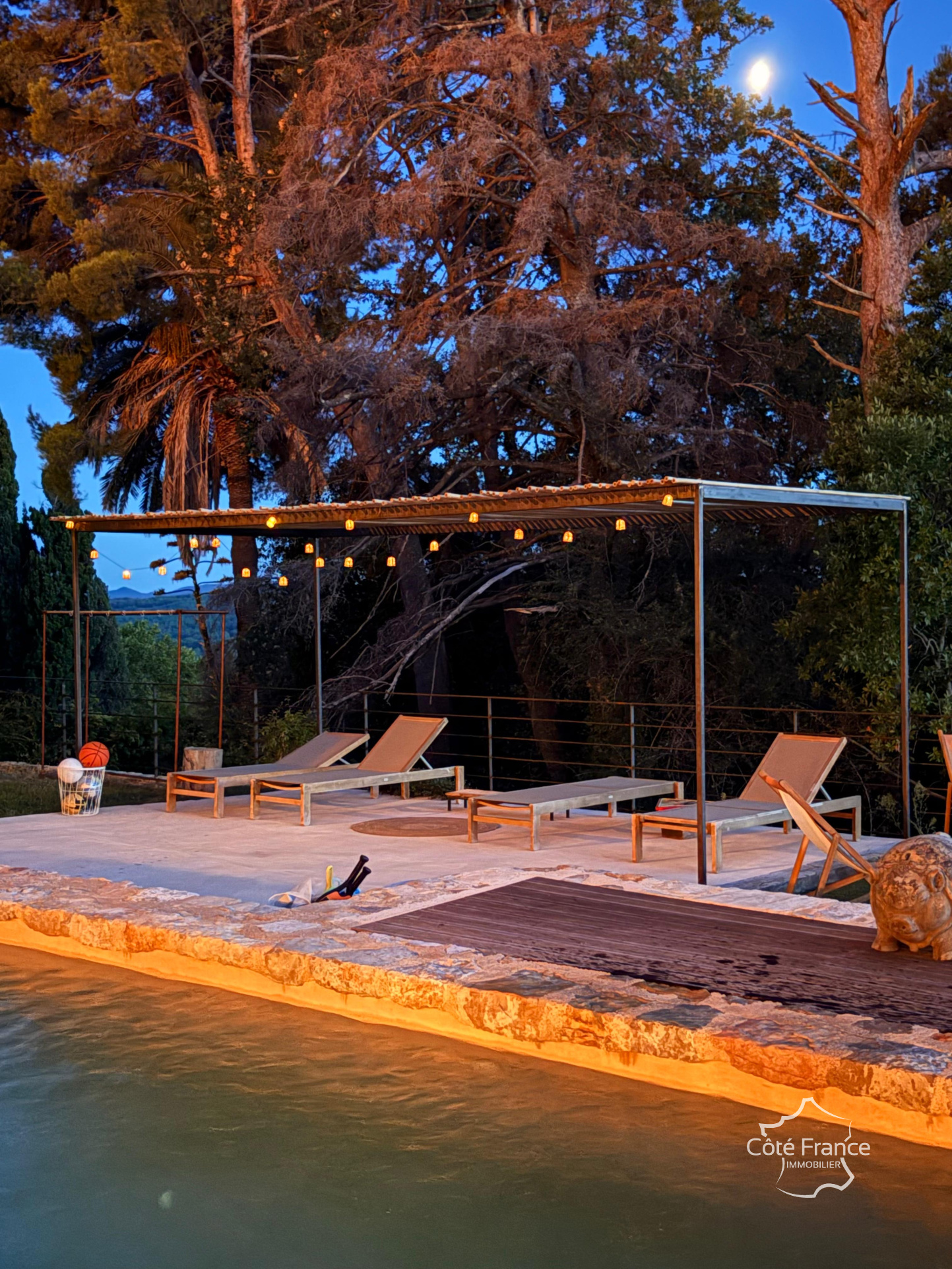 Mais vous pouvez également accéder au jardin directement depuis le hall ou le séjour. Et quelle vue ! Absolument magnifique! Le jardin (près de 1000 m²) est orienté sud-ouest, parfait pour profiter du soleil et des couchers de soleil sur les montagnes au loin. Ou vous pouvez chercher l’ombre sur la terrasse avec sa table en pierre, sous le grand arbre. Il y a un petit potager, un bassin, plusieurs terrasses avec ou sans pergola, une cuisine d’été et un coin lounge avec brasero, sans oublier la superbe piscine au sel.